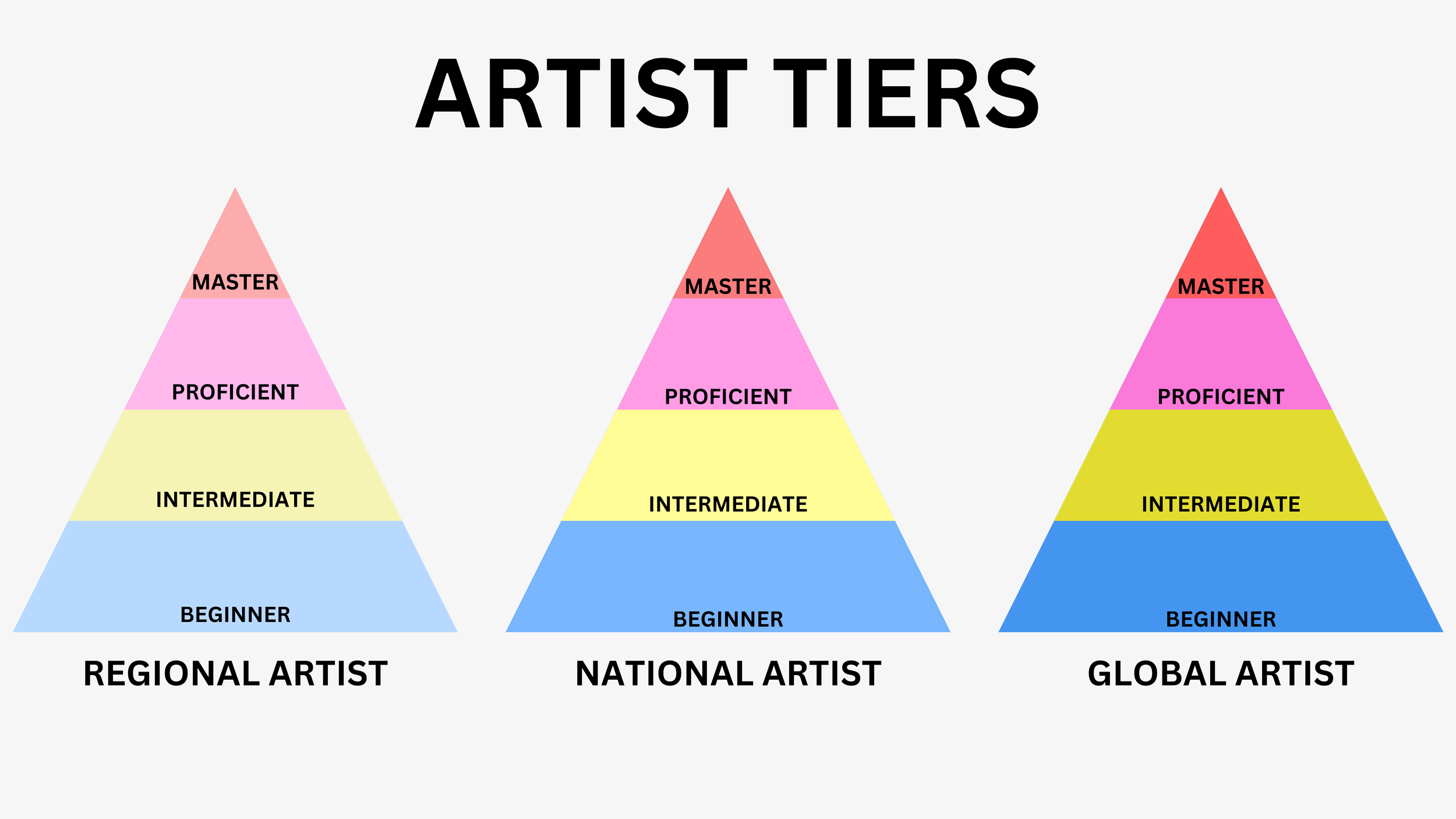 Let’s dive in on the tiers. We use four basic categories, beginning, intermediate, proficient, and master. But to these categories, we also apply reach, which starts at regional, graduates to national, and then global. So, for example, you might be a master regional artist, but a beginner or intermediate national artist. And these distinctions can easily be read by someone with a high degree of literacy in the art world, just by looking at a CV, but might not be immediately apparent to you. And the reason knowing these distinctions is important, is because knowing where you start, allows you to set realistic goals on where you want to go.